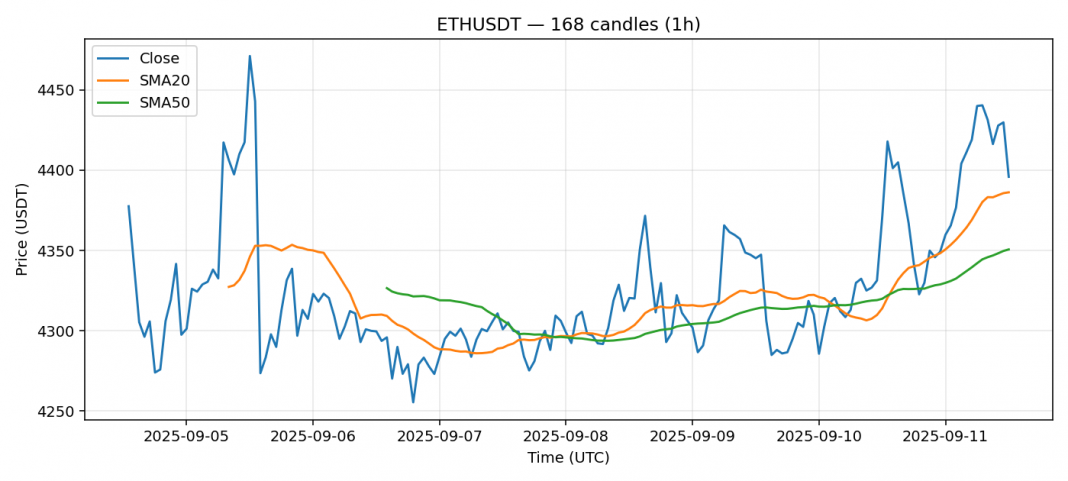 Ethereum — 1h candles, 7D window (SMA20/SMA50, RSI).