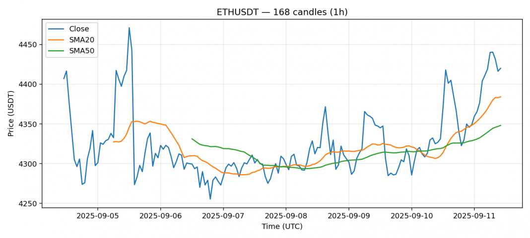 Ethereum — 1h candles, 7D window (SMA20/SMA50, RSI).