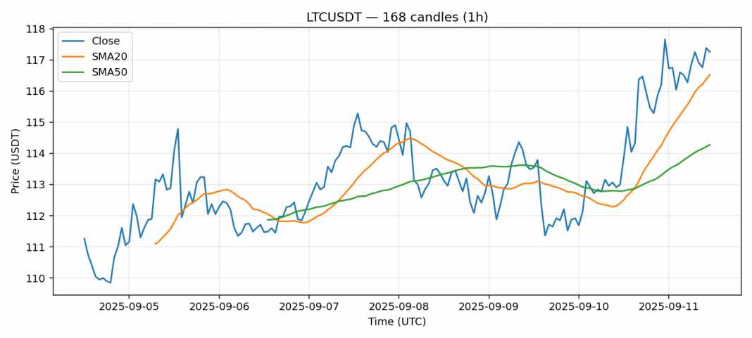 Litecoin — 1h candles, 7D window (SMA20/SMA50, RSI).