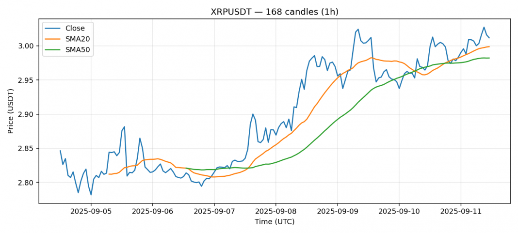 Ripple — 1h candles, 7D window (SMA20/SMA50, RSI).