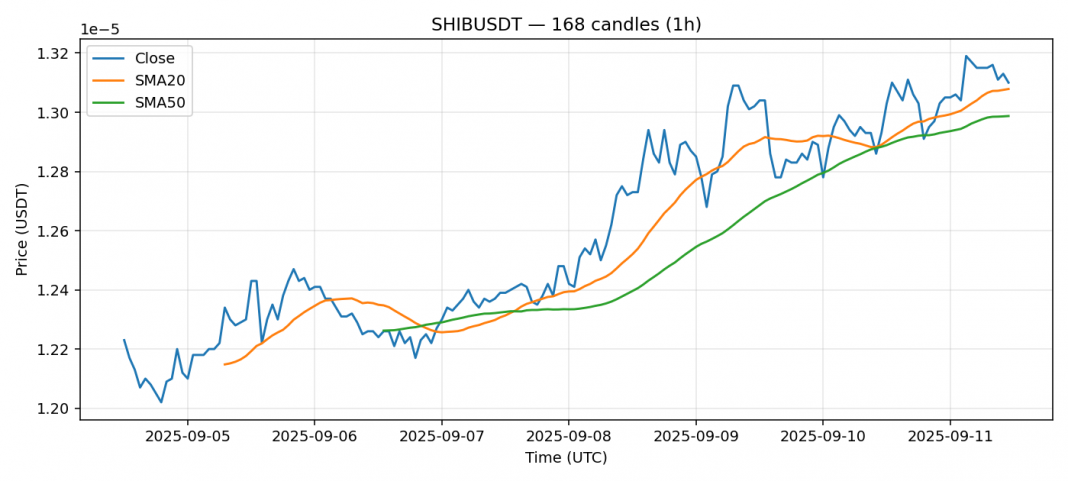 Shiba Inu — 1h candles, 7D window (SMA20/SMA50, RSI).