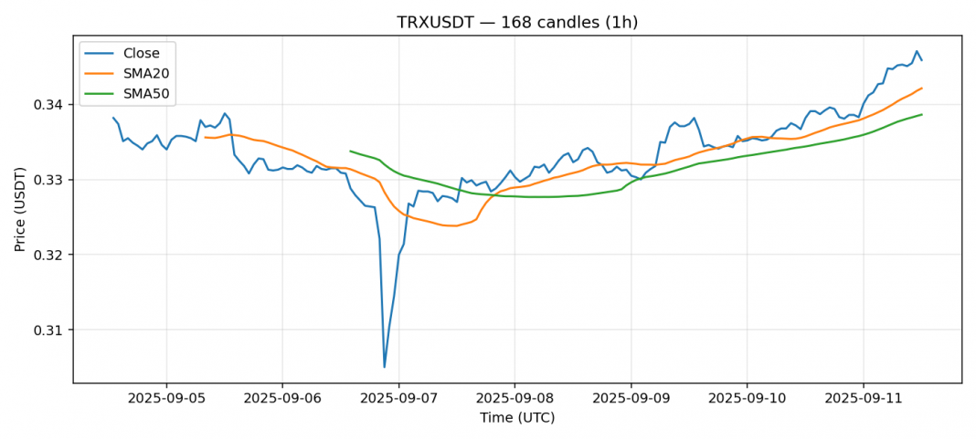 TRON — 1h candles, 7D window (SMA20/SMA50, RSI).