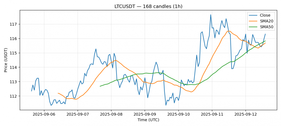 LTCUSDT is currently trading at $116.31, showing a modest 24-hour gain of 0.44%. The price is hovering just above the 20-day SMA at $115.69 and slightly below the 50-day SMA at $115.83, indicating a neutral to slightly bullish near-term bias. The RSI reading of exactly 50 suggests a perfectly balanced momentum, neither overbought nor oversold. With 24-hour volume at $57.99M and volatility at 2.23%, Litecoin appears to be in a consolidation phase. Given these technical indicators, I’d recommend waiting for a clear breakout above $117 (50-day SMA resistance) before considering long positions, or a breakdown below $115 for short opportunities. Keep stops tight given the current low volatility environment.