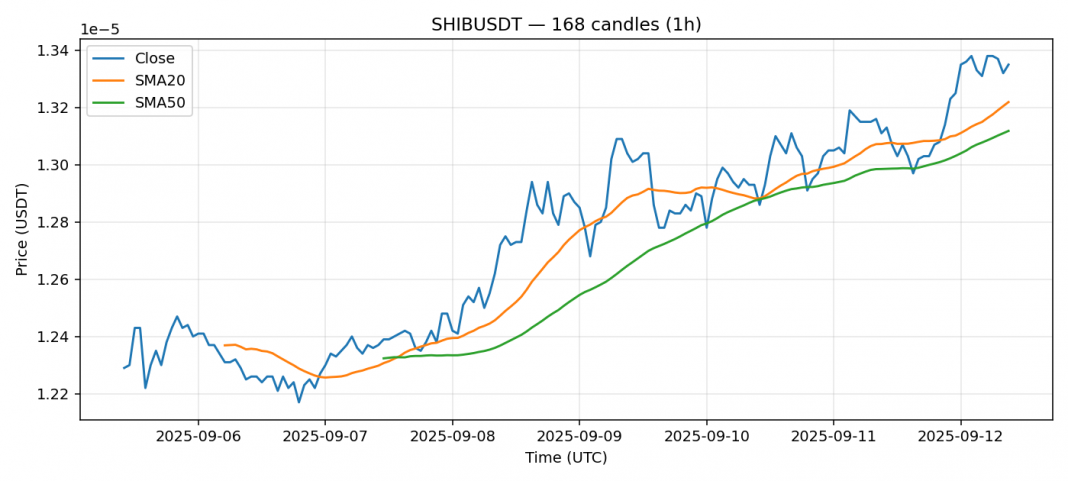 Shiba Inu — 1h candles, 7D window (SMA20/SMA50, RSI).