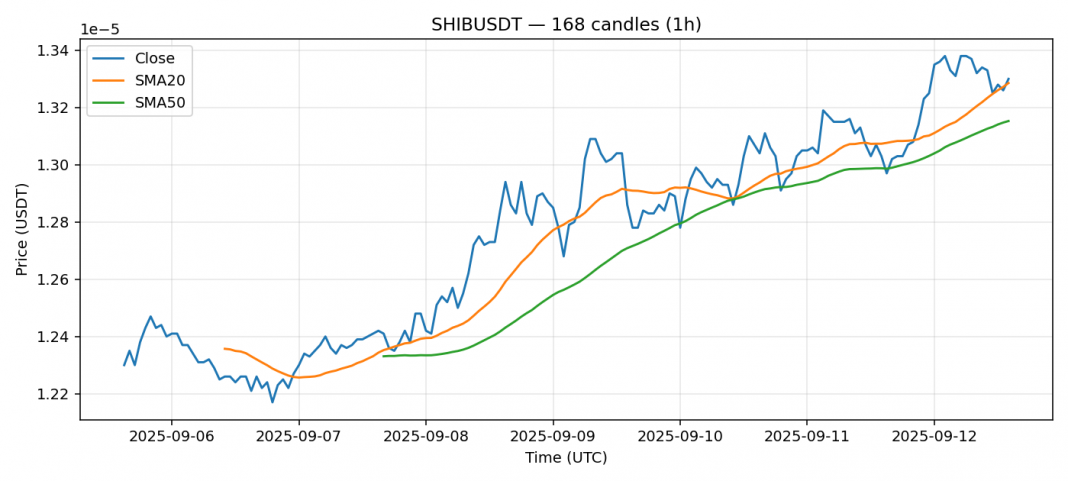 Shiba Inu — 1h candles, 7D window (SMA20/SMA50, RSI).