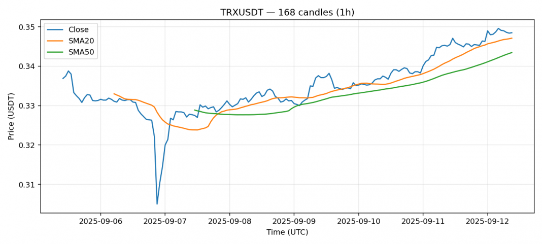 TRON — 1h candles, 7D window (SMA20/SMA50, RSI).