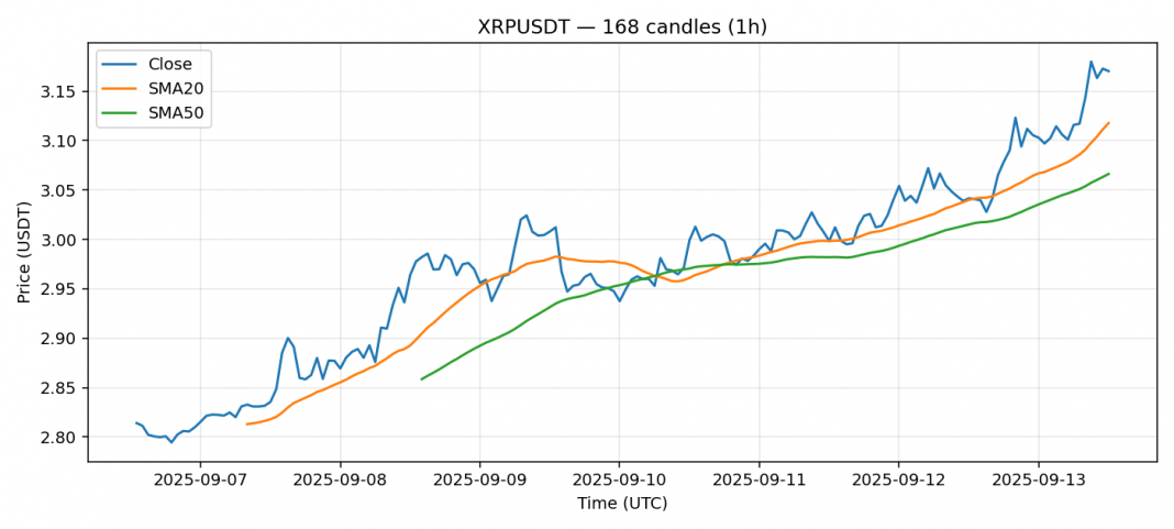 Ripple — 1h candles, 7D window (SMA20/SMA50, RSI).