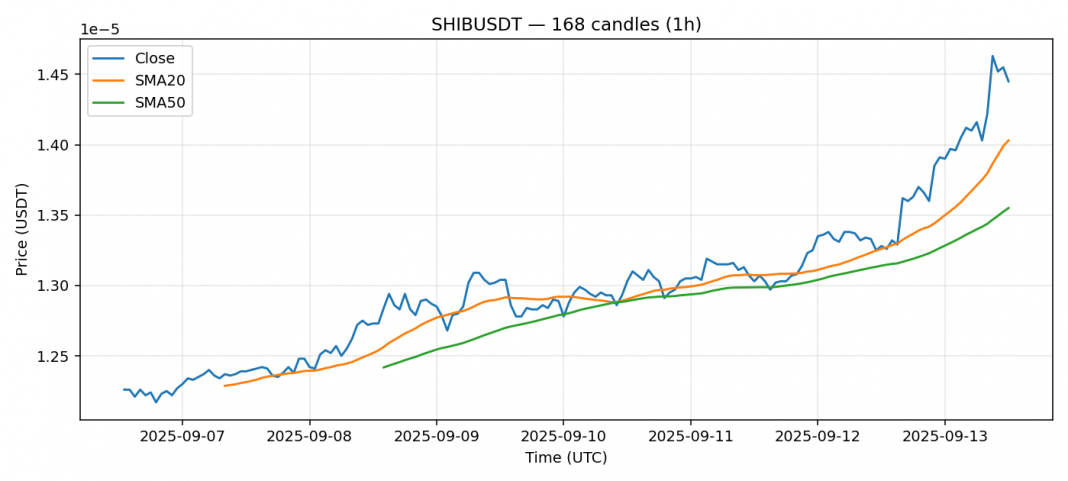 Shiba Inu — 1h candles, 7D window (SMA20/SMA50, RSI).