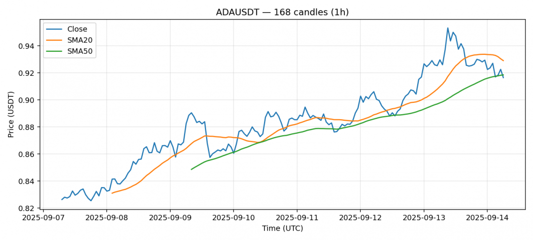 Cardano — 1h candles, 7D window (SMA20/SMA50, RSI).