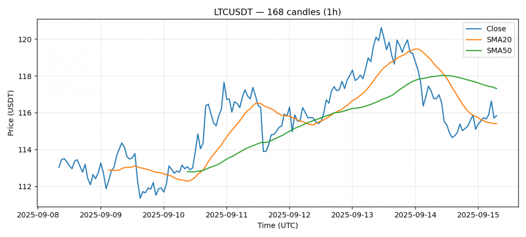 Litecoin — 1h candles, 7D window (SMA20/SMA50, RSI).