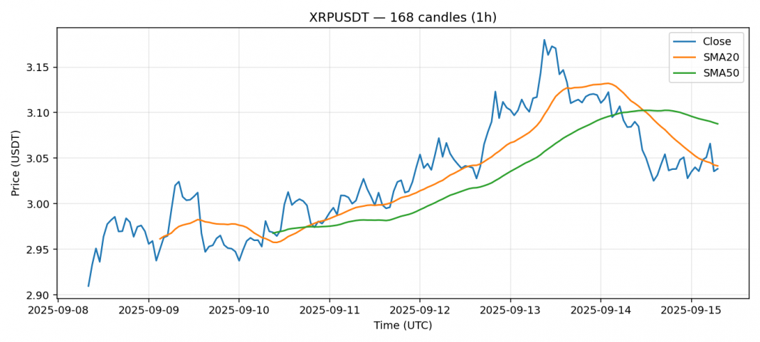 Ripple — 1h candles, 7D window (SMA20/SMA50, RSI).