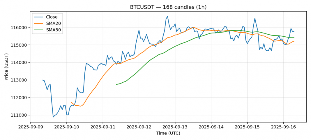 Bitcoin — 1h candles, 7D window (SMA20/SMA50, RSI).