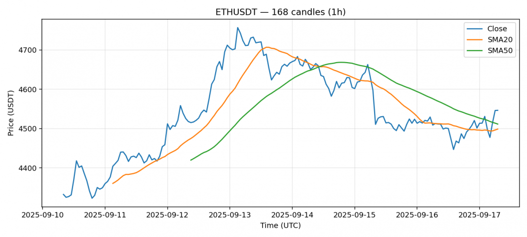 Ethereum — 1h candles, 7D window (SMA20/SMA50, RSI).