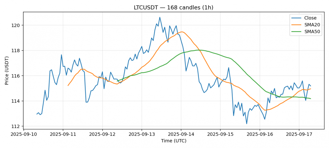Litecoin — 1h candles, 7D window (SMA20/SMA50, RSI).