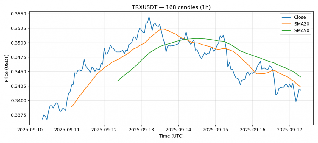 TRON — 1h candles, 7D window (SMA20/SMA50, RSI).