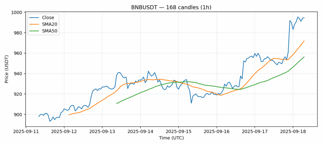 BNB — 1h candles, 7D window (SMA20/SMA50, RSI).