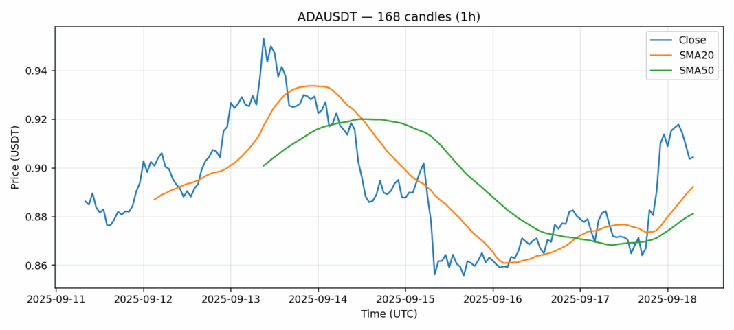 Cardano — 1h candles, 7D window (SMA20/SMA50, RSI).