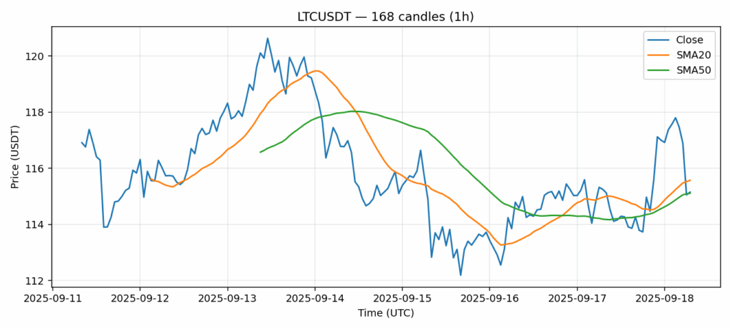 Litecoin — 1h candles, 7D window (SMA20/SMA50, RSI).