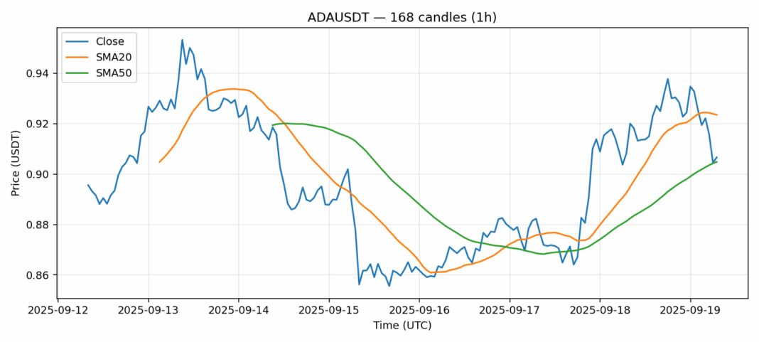 Cardano — 1h candles, 7D window (SMA20/SMA50, RSI).