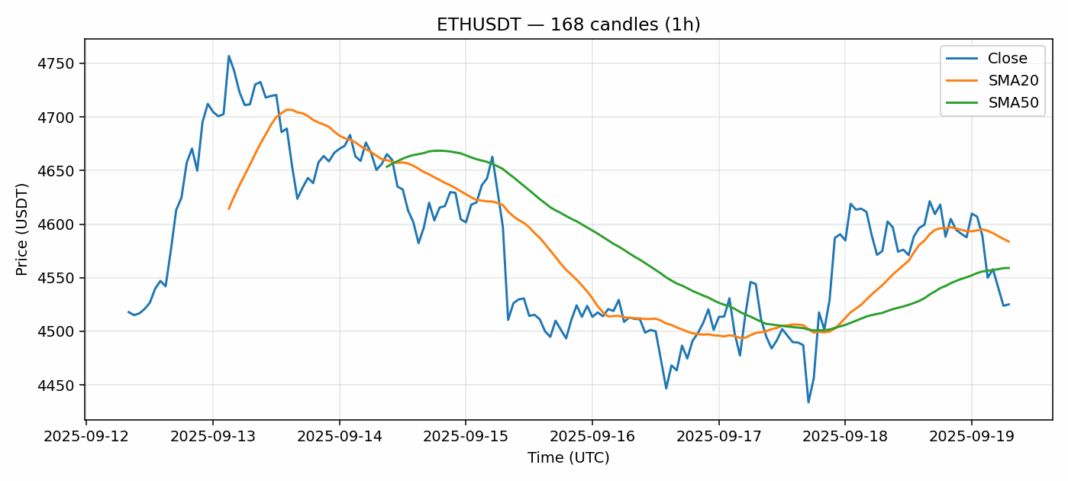 Ethereum — 1h candles, 7D window (SMA20/SMA50, RSI).