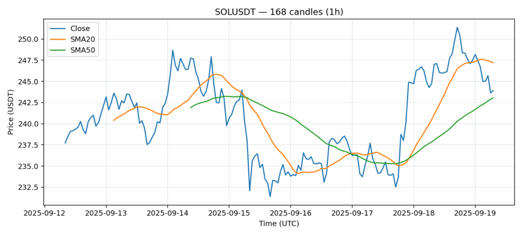 Solana — 1h candles, 7D window (SMA20/SMA50, RSI).