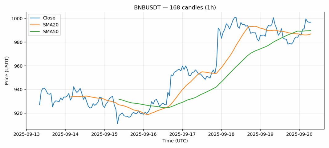 BNB — 1h candles, 7D window (SMA20/SMA50, RSI).
