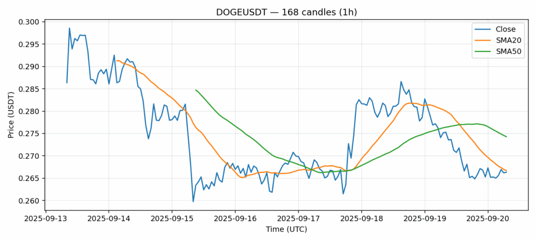 Dogecoin — 1h candles, 7D window (SMA20/SMA50, RSI).