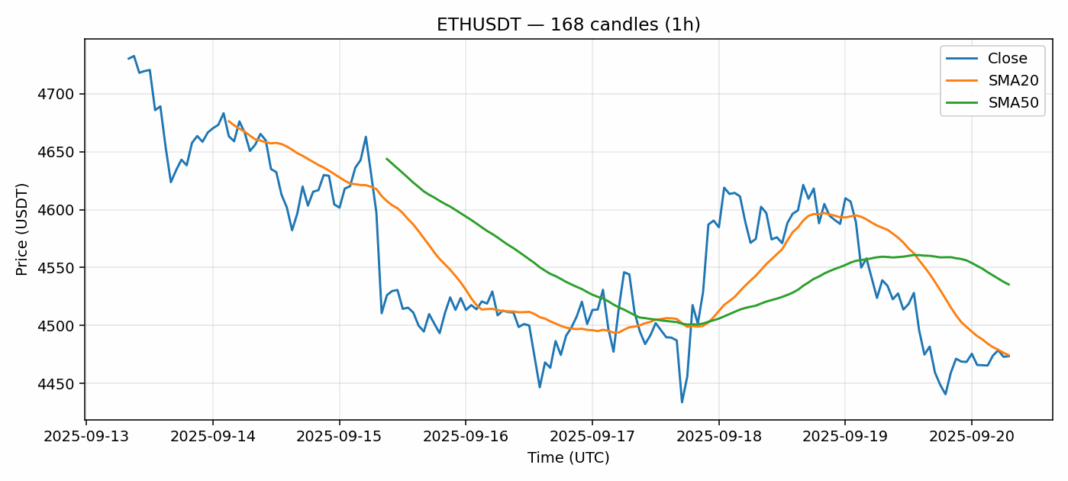 Ethereum — 1h candles, 7D window (SMA20/SMA50, RSI).