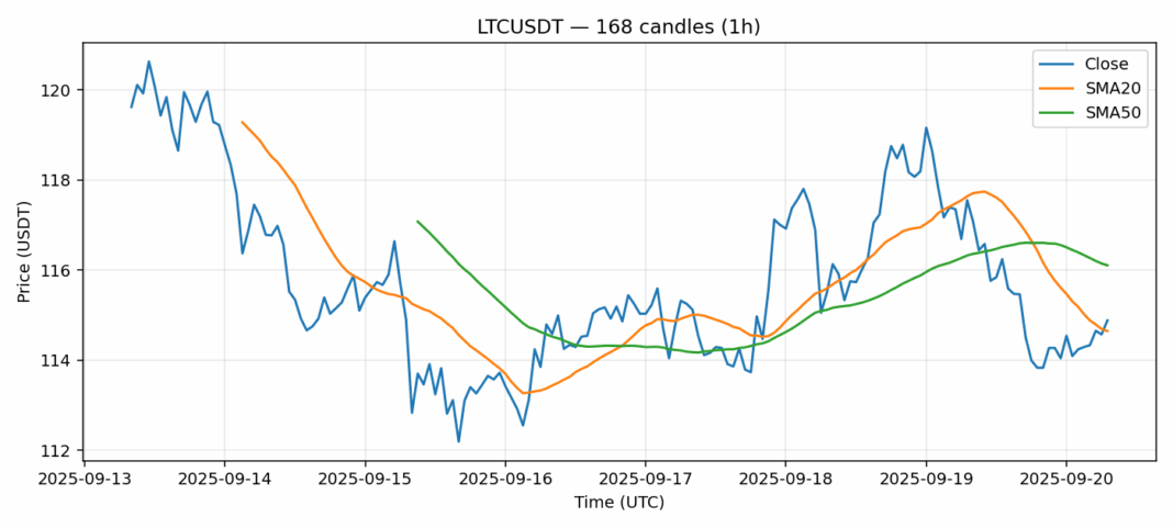 Litecoin — 1h candles, 7D window (SMA20/SMA50, RSI).