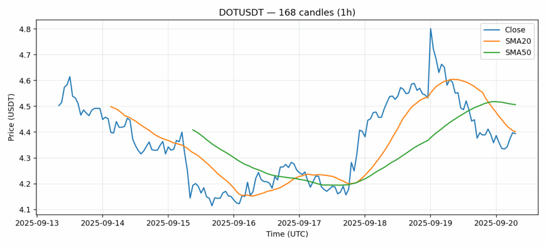 Polkadot — 1h candles, 7D window (SMA20/SMA50, RSI).