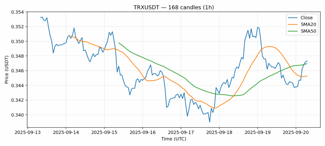 TRON — 1h candles, 7D window (SMA20/SMA50, RSI).