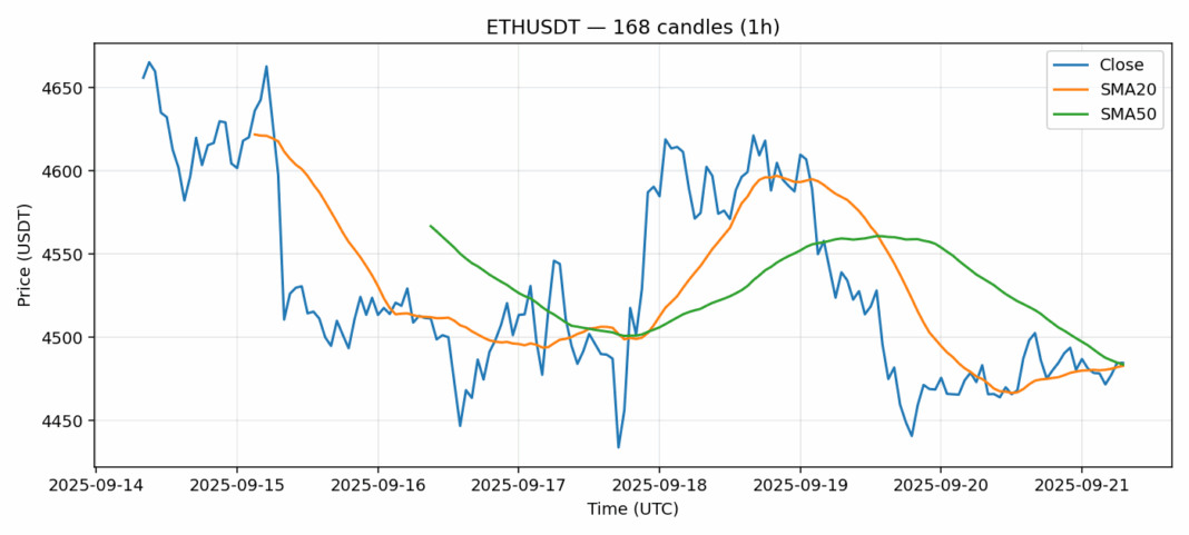 Ethereum — 1h candles, 7D window (SMA20/SMA50, RSI).
