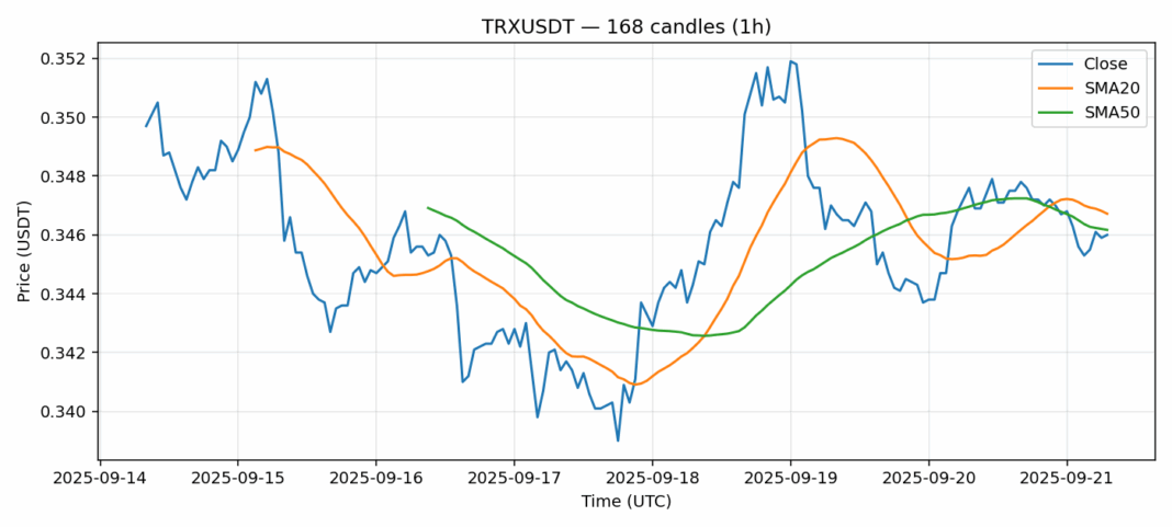 TRON — 1h candles, 7D window (SMA20/SMA50, RSI).