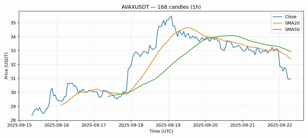 AVAX is showing significant weakness, trading at $30.95 with a sharp 6.13% decline over the past 24 hours. The RSI reading of 20.76 indicates severely oversold conditions, typically suggesting potential for a short-term bounce. However, the price remains below both the 20-day SMA ($32.38) and 50-day SMA ($32.91), confirming the bearish momentum. Volume remains elevated at $140M, indicating active selling pressure. Given the high volatility of 4.46%, traders should exercise caution. I’d recommend waiting for RSI to recover above 30 before considering long positions. Short-term traders might look for a bounce from these oversold levels, but any rally should be treated as corrective rather than trend-changing. Set tight stops if attempting to catch the falling knife.