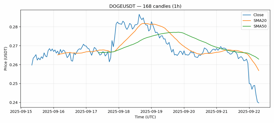 Dogecoin — 1h candles, 7D window (SMA20/SMA50, RSI).