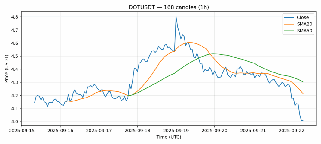 Polkadot — 1h candles, 7D window (SMA20/SMA50, RSI).