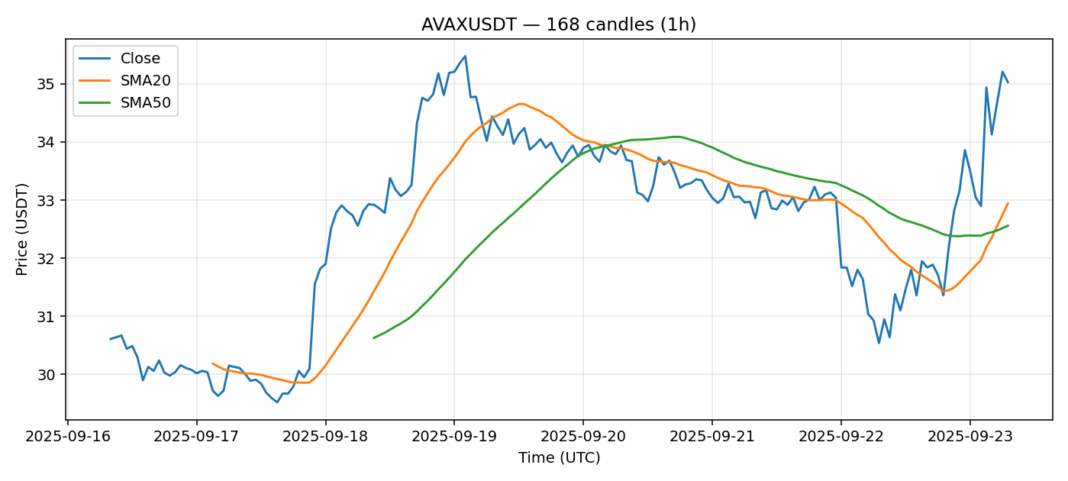 Avalanche — 1h candles, 7D window (SMA20/SMA50, RSI).