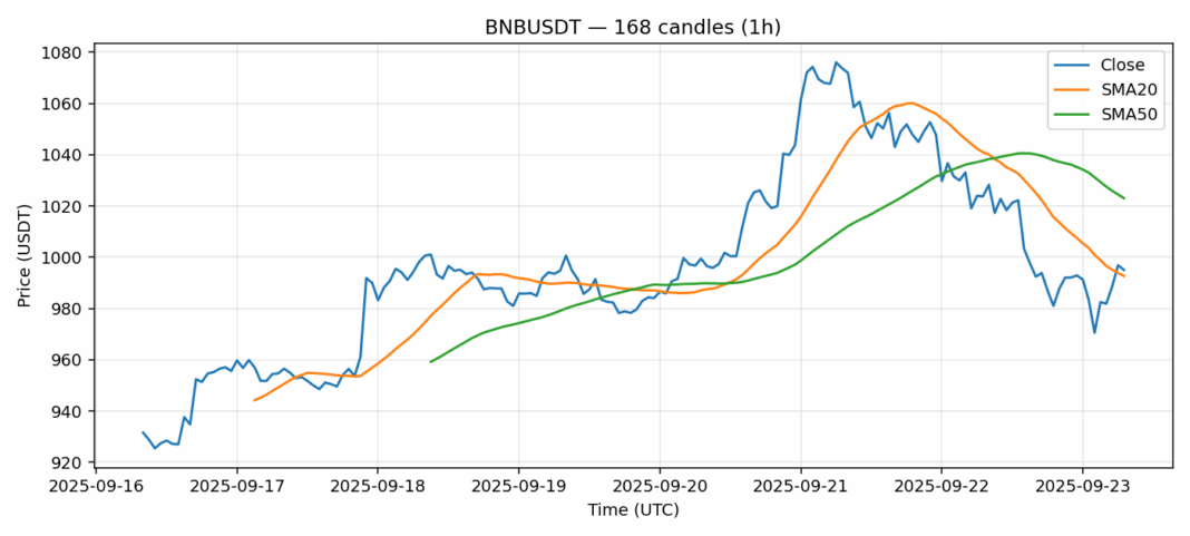 BNB — 1h candles, 7D window (SMA20/SMA50, RSI).