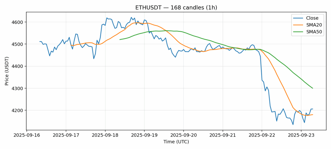 Ethereum — 1h candles, 7D window (SMA20/SMA50, RSI).