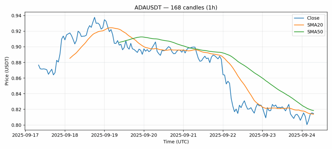 Cardano — 1h candles, 7D window (SMA20/SMA50, RSI).