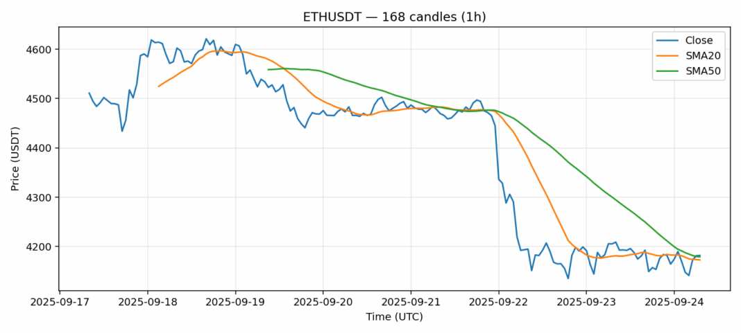 Ethereum — 1h candles, 7D window (SMA20/SMA50, RSI).