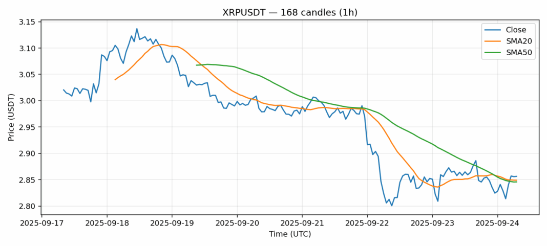 XRPUSDT is showing consolidation around the $2.85 level with minimal deviation from key moving averages. The current price of $2.8563 sits just above both the 20-day SMA ($2.849) and 50-day SMA ($2.846), indicating potential support confluence. However, the 24-hour decline of 0.57% suggests mild selling pressure despite healthy volume of $297M. The RSI at 52.93 reflects neutral momentum without overbought or oversold conditions. Volatility remains moderate at 2.32%, typical for XRP’s characteristic price action. Traders should watch for a decisive break above $2.90 for bullish continuation toward $3.00 resistance, while a breakdown below the SMA cluster around $2.845 could trigger a test of $2.80 support. Given the tight range, consider waiting for a clear directional breakout with volume confirmation before entering new positions. Scalpers might find opportunities in the current range-bound movement.