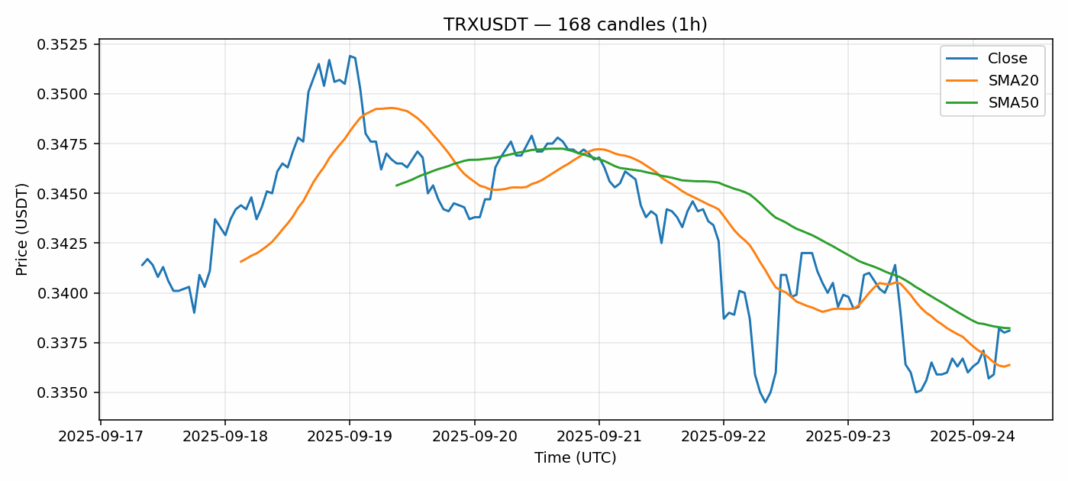 TRON — 1h candles, 7D window (SMA20/SMA50, RSI).