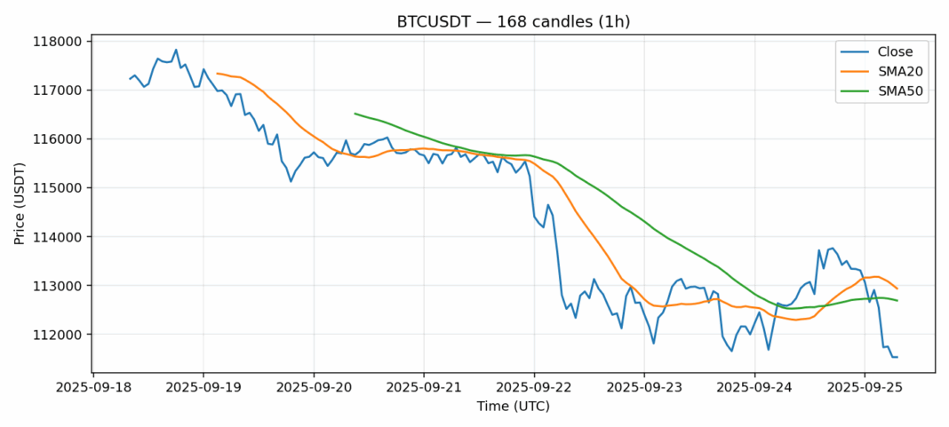 Bitcoin — 1h candles, 7D window (SMA20/SMA50, RSI).