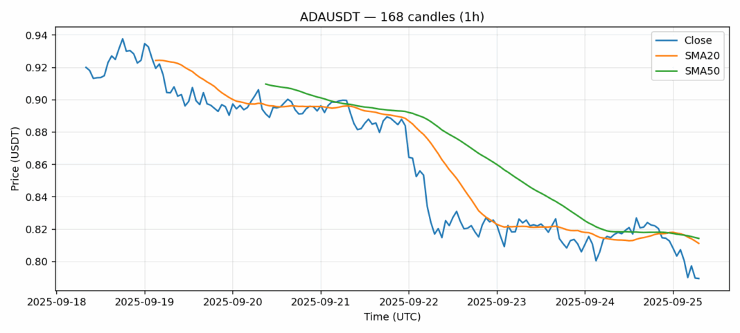 Cardano — 1h candles, 7D window (SMA20/SMA50, RSI).