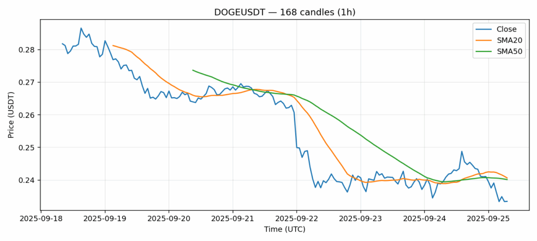 Dogecoin — 1h candles, 7D window (SMA20/SMA50, RSI).