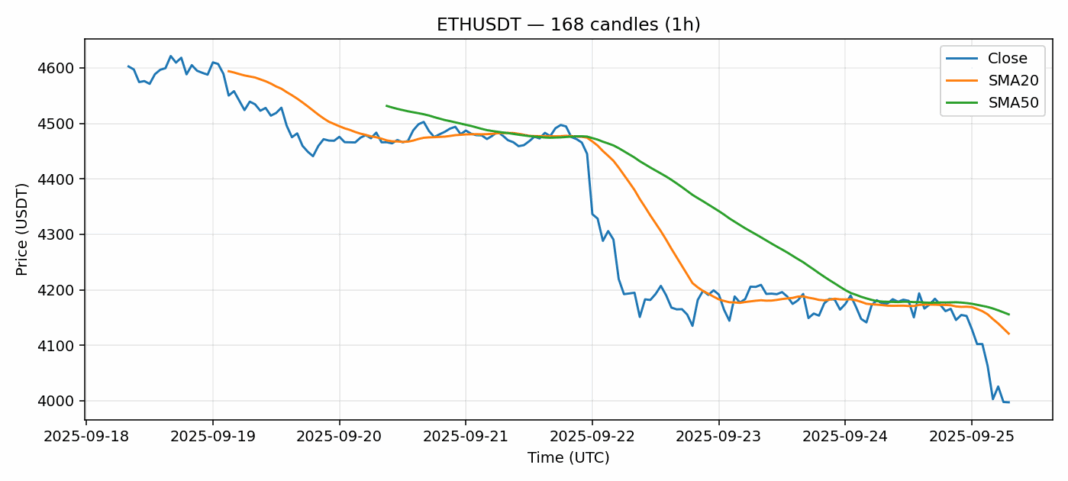 Ethereum — 1h candles, 7D window (SMA20/SMA50, RSI).