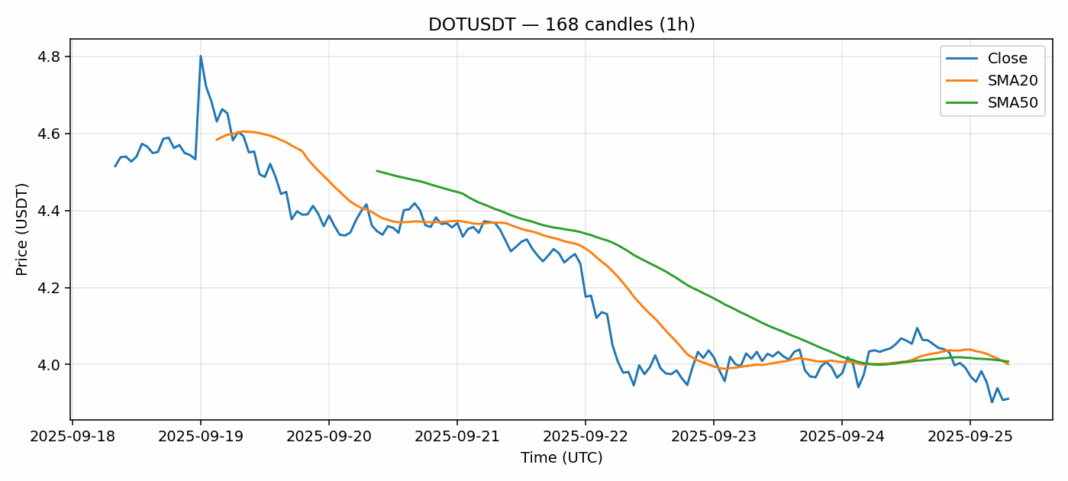 Polkadot — 1h candles, 7D window (SMA20/SMA50, RSI).