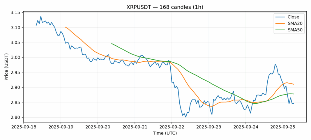Ripple — 1h candles, 7D window (SMA20/SMA50, RSI).