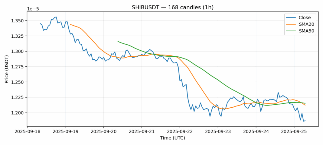 Shiba Inu — 1h candles, 7D window (SMA20/SMA50, RSI).